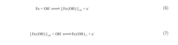 Fe氧化生成Fe(OH)2的反應(yīng),一些學(xué)者認(rèn)為涉及到OH-離子吸附的反應(yīng),見式(6)和(7)