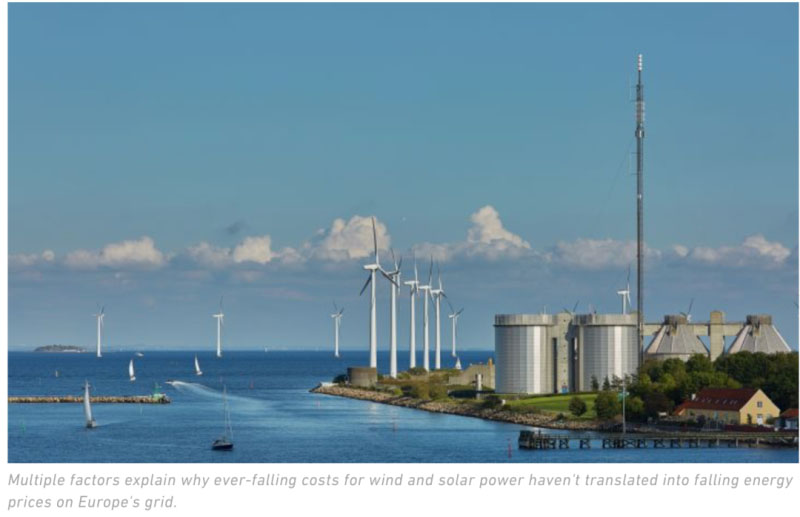 這里有幾個(gè)原因需要考慮。首先,可再生能源在整個(gè)歐洲發(fā)電量中所占的比例仍然相對(duì)較小。第二,最新的太陽(yáng)能和風(fēng)能項(xiàng)目的LCOE下降幅度還沒(méi)有超過(guò)通過(guò)上網(wǎng)電價(jià)等支持機(jī)制補(bǔ)貼的既有的清潔能源電廠成本。另一種解釋是風(fēng)力發(fā)電廠和太陽(yáng)能發(fā)電廠的可變產(chǎn)量必須通過(guò)礦物燃料發(fā)電機(jī)頻繁、快速的上下波動(dòng)來(lái)平衡,這增加了電力成本和碳排放的上升。但還有另一個(gè)更重要的因素需要考慮:雖然低成本的可再生能源抵消了電網(wǎng)的一部分需求,但仍需要化石燃料發(fā)電廠設(shè)定電力市場(chǎng)的邊際成本。