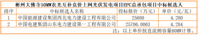 從公示中了解到,中國能源建設(shè)集團(tuán)西北電力建設(shè)工程有限公司以25680萬元的投標(biāo)報(bào)價(jià),單價(jià)4.28元/瓦位列第一中標(biāo)候選人。