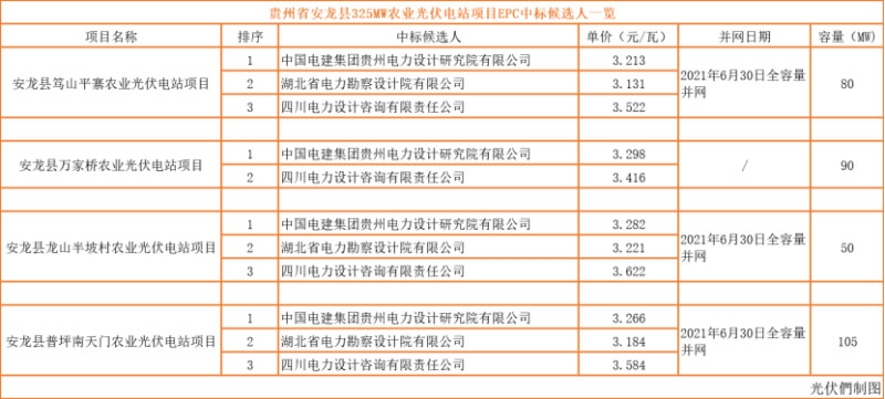 中國儲能網(wǎng)訊:11月4-5日,貴州省安龍縣四個(gè)農(nóng)業(yè)光伏電站項(xiàng)目EPC總承包工程中標(biāo)候選人公示,四個(gè)項(xiàng)目分別為安龍縣篤山平寨農(nóng)業(yè)光伏電站項(xiàng)目、安龍縣萬家橋農(nóng)業(yè)光伏電站項(xiàng)目、安龍縣龍山半坡村農(nóng)業(yè)光伏電站項(xiàng)目、安龍縣普坪南天門農(nóng)業(yè)光伏電站項(xiàng)目;合計(jì)總?cè)萘繛?25MW。其中中國電建集團(tuán)貴州電力設(shè)計(jì)研究院有限公司分別以3.213元/瓦、3.298元/瓦、3.282元/瓦、3.266元/瓦,位列中標(biāo)候選人第一位。