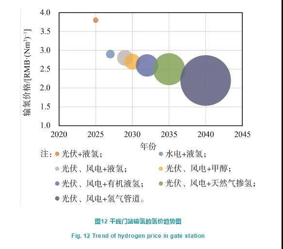如圖12所示,隨著規(guī)模的擴(kuò)大,氫能的綜合成本、門站氫價(jià)在逐步下降,隨著氫能規(guī)模的上升和制氫儲(chǔ)氫成本下降,有望在未來低于2.0 RMB/Nm3。