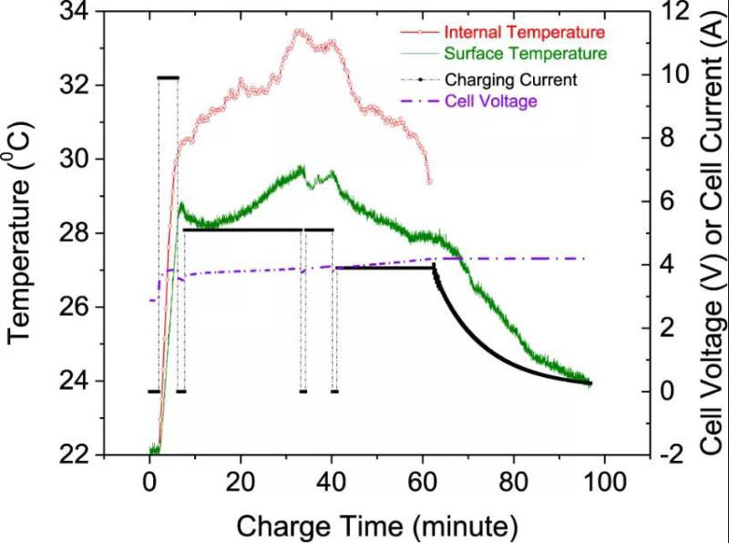 如圖4所示為快速充電的例子,利用電池內(nèi)部溫度來決定充電的過程。電池快速充電不僅方便了電動汽車,而且在電網(wǎng)應用中也是必不可少的。它也是一個操作參數(shù),可以增加電池內(nèi)部溫度,潛在地加速電池老化,推動它進入TR和排氣。試圖使用表面溫度作為參數(shù)來保護電池不排氣可能會產(chǎn)生誤導,因此是有害的。圖4中的數(shù)據(jù)是由電池中的一個電池單元(5.3 Ah),開始以接近2 C的速率充電。這個例子中的電池通常以0.7 C的速率充電,完全放電后大約需要120 min才能充滿。當溫度提高到35℃以上時,iPROUD將電流轉換為零,使電池內(nèi)部冷卻,并在其他時間將充電速率限制在0.7 C和0.5 C,電池完全充電的總時間是95 min。相反,如果選擇電池表面溫度作為參數(shù),并將其限制設置為35℃以切斷電流,則溫度會增加到一個更高的值,會加速電池老化,導致電池熱失控。iPROUD將溫度和電池電壓作為控制參數(shù),通過電池的電解質和電荷轉移電阻以及庫侖容量以改善電池管理,從而獲得更高的安全性、長壽命以及能量存儲和動力傳輸效率。