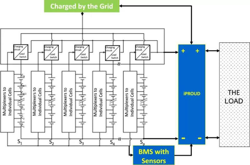 BMS-iPROUD的概念示意圖如圖3所示,iPROUD的作用不僅接收來自BMS的信息,還通過雙向通信通道接收來自負載和電網(wǎng)的信息。iPROUD設備的目標是調節(jié)電池從電網(wǎng)接收和存儲能量的速率,以及電池支持負載的速率。BMS具有每個電池的內(nèi)部狀態(tài)(如電壓、溫度、阻抗等)的傳感器,監(jiān)視和管理電池中的每個電池,并將這些數(shù)據(jù)輸入到iPROUD中。它使用這些數(shù)據(jù)將每個電池的內(nèi)部狀態(tài)與電池的功能性能聯(lián)系起來,并將數(shù)據(jù)與從負載接收的信息相結合,決定電池可提供的電力支持水平。它對電網(wǎng)與電池的相互作用做出類似的決定。如果BMS檢測到電池中任何一個電池的內(nèi)部狀態(tài)異常,那么iPROUD將不允許給異常電池模塊充電,直到電池狀態(tài)恢復正常。
