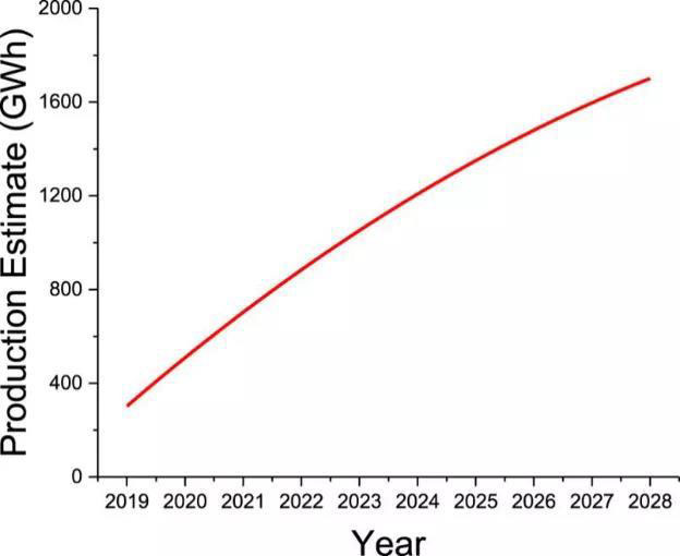 圖1. 未來十年鋰電池全球產(chǎn)量的預期增長。