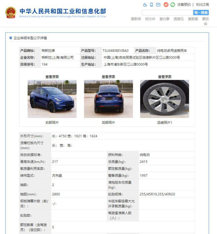 中國儲(chǔ)能網(wǎng)訊:11月5日,工信部發(fā)布《道路機(jī)動(dòng)車輛生產(chǎn)企業(yè)及產(chǎn)品公告》(第338批)的車輛新產(chǎn)品公示清單。特斯拉國產(chǎn)Model Y的信息在列,完成工信部申報(bào)。