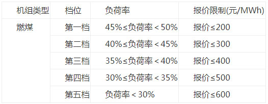 燃煤機組以額定容量的5%作為一個報價區(qū)間。申報價格為減發(fā)電量價格,隨調峰深度增加按非遞減原則報價,每個報價區(qū)間設置報價上限。具體分檔及報價上限為: