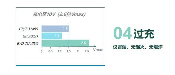 在過充測(cè)試中,比亞迪刀片電池以1倍率電流充電至終止電壓的2.6倍時(shí)終止充電,并且在1小時(shí)觀察期內(nèi)沒有出現(xiàn)起火、爆炸等現(xiàn)象。用更高的防過充標(biāo)準(zhǔn)降低由過充引發(fā)自燃的幾率,刀片電池讓新能源汽車的安全性能更上一層樓。