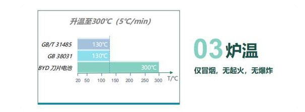 刀片電池使用磷酸鐵鋰材料,耐高溫性能更加優(yōu)異。爐溫測(cè)試中,刀片電池在超過國家標(biāo)準(zhǔn)要求溫度2倍多、達(dá)到300°高溫情況下保持30分鐘,期間沒有出現(xiàn)起火或者爆炸等現(xiàn)象。當(dāng)遇到停車場(chǎng)相鄰車輛起火等狀況,刀片電池超強(qiáng)的耐高溫性能,能夠讓新能源汽車在高溫環(huán)境下最大限度保證電池安全。