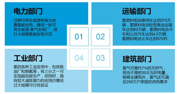 2019年2月,歐洲燃料電池和氫能聯合組織結合17家活躍于氫和燃料電池技術領域的企業(yè)的信息和數據,制定并發(fā)布《歐洲氫能路線圖:歐洲能源轉型的可持續(xù)發(fā)展路徑》。報告提出歐洲發(fā)展氫能的路線圖,明確到2030年歐洲在氫能發(fā)電、氫燃料電池汽車、家庭和建筑物用氫、工業(yè)制氫用氫等方面的具體目標(見圖5)。