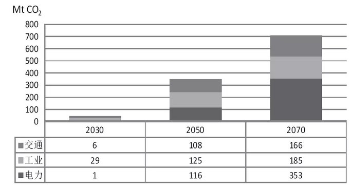 在國際能源署的可持續(xù)發(fā)展情景中,預計到2030年,歐洲的二氧化碳捕集量將增加到3500萬噸左右,到2050年將達到3.5億噸,到2070年將超過7億噸(見圖4)。2019~2070年間,利用CCUS技術捕集的二氧化碳中,42%來自電力部門,31%來自工業(yè)部門,26%來自交通部門。到2050年,捕獲的二氧化碳大部分與化石燃料的使用有關。2050年后,生物能源碳捕獲和儲存(BECCS)和直接空氣碳捕集(DAC)將發(fā)揮更為突出的作用。到2070年,電力部門捕獲的二氧化碳中三分之二與BECCS有關。