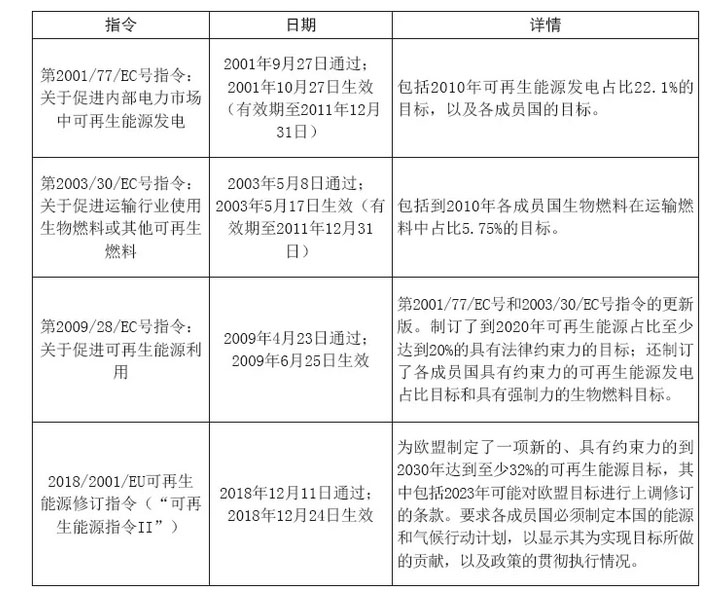 歐盟可再生能源政策發(fā)端于1997年的《可再生能源白皮書》。此后,歐盟陸續(xù)發(fā)布2001/77/EC、2003/30/EC等可再生能源指令,到2009年6月歐盟發(fā)布可再生能源指令2009/28/EC,基本上已形成相對完備的可再生能源發(fā)展法律框架(見表2)。歐盟委員會要求成員國將可再生能源指令轉化為國家立法,并制訂相應的國家可再生能源行動計劃和支持政策。