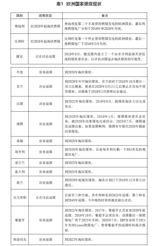 為了落實《巴黎協定》中的溫室氣體減排目標,歐洲各國政府陸續(xù)公布了淘汰煤炭的時間表(見表1)。第一個結束燃煤使用歷史的歐洲國家為比利時,該國于2016年停止使用煤炭。2020年,奧地利和瑞典相繼關停各自國內最后一座燃煤電廠,正式結束燃煤發(fā)電歷史。