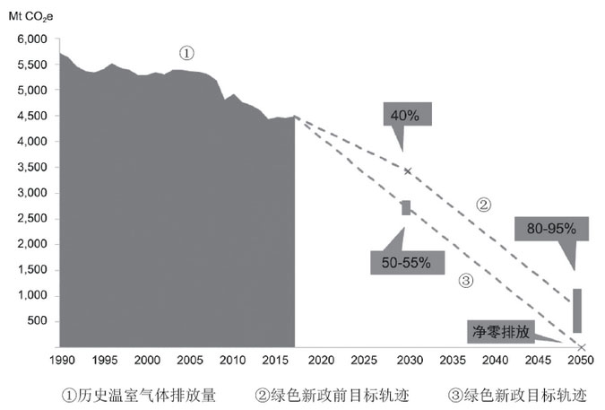 2019年12月,歐盟委員會正式發(fā)布《歐洲綠色協議》(簡稱“綠色新政”),闡明歐洲邁向氣候中性循環(huán)經濟體的行動路線,提出提高歐盟2030和2050年氣候目標,即2030年溫室氣體排放量在1990年基礎上減少50%~55%,2050年實現凈零排放的碳中和目標(見圖1)。