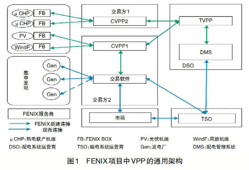 2005年~2009年,來自歐盟8個國家的20個研究機構(gòu)和組織合作實施和開展了FENIX項目,F(xiàn)ENIX的目標(biāo)是通過將分布式能源資源聚合成大型VPP和分散管理,最大限度地提高分布式能源對電力系統(tǒng)的貢獻,擺脫傳統(tǒng)對電力系統(tǒng)小單元的管理。