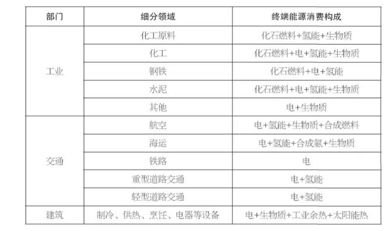 2.交通部門。為了實(shí)現(xiàn)我國(guó)交通部門的碳中和,需要將路面運(yùn)輸(公路和鐵路服務(wù))全面電氣化,同時(shí)長(zhǎng)途航空和船運(yùn)改用零碳燃料(氫氣、氨等)。1)路面交通。目前,我國(guó)高鐵已基本實(shí)現(xiàn)了全面電氣化,普通速度的鐵路交通在未來(lái)也將逐步實(shí)現(xiàn)全面電氣化。純電動(dòng)汽車將在未來(lái)主導(dǎo)中短距離的交通出行,而氫燃料電池汽車則會(huì)在長(zhǎng)距離貨運(yùn)卡車和重型卡車中占據(jù)主要地位。2)航空和海運(yùn)。針對(duì)航空海運(yùn)領(lǐng)域,直接應(yīng)用電氣化實(shí)現(xiàn)碳中和的空間較小,因此,航空和海運(yùn)交通的脫碳則必須主要依靠零碳的新型燃料。對(duì)于航空領(lǐng)域,依靠生物航空燃油和合成航空燃油是實(shí)現(xiàn)碳中和的主要技術(shù)路徑。此外,未來(lái)需要使用生物燃料和氨對(duì)船運(yùn)領(lǐng)域進(jìn)行深度脫碳。綜上,零碳電能、氫能、航空燃油、生物燃料和氨等多種綜合能源的使用將會(huì)進(jìn)一步加速我國(guó)碳中和目標(biāo)的實(shí)現(xiàn)。