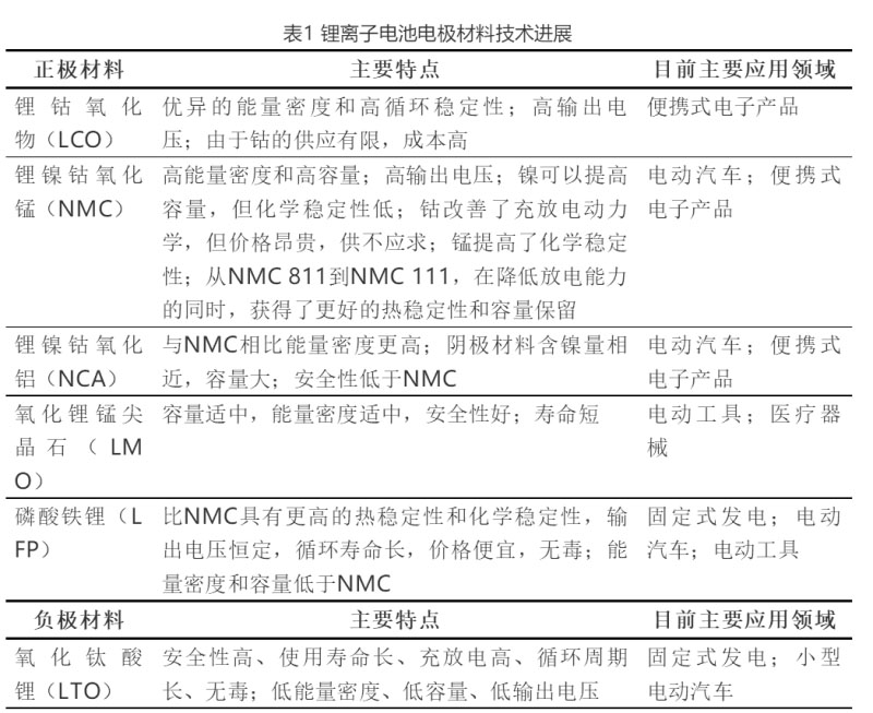 (1)鋰離子電池電極材料技術進展情況。自2000年以來,鋰離子電極材料相關專利申請數(shù)量一直穩(wěn)定增長。2010-2013年間,從355件增加到近900件。到2018年,約40%電極專利均涉及鋰離子技術。鋰離子電池正極材料一直是發(fā)明競爭的焦點,因為它是決定電池的體積能量密度、質量能量密度等性能和降低成本的限制因素。體積能源密度對于便攜式設備至關重要;體積能量密度和質量能量密度均對電動汽車極為重要,必須確保與內燃機汽車的性能和成本相當,同時保持車輛重量。具體技術進展如表1所示。