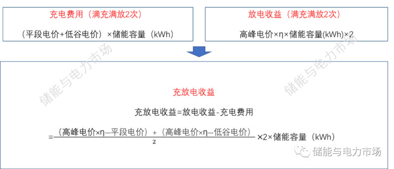 假設(shè)每天兩充兩放,充放電效率為η,不考慮特殊情況下的尖峰電價(jià),只考慮高峰、平段、低谷電價(jià),充放電收益的計(jì)算可總結(jié)為下圖。