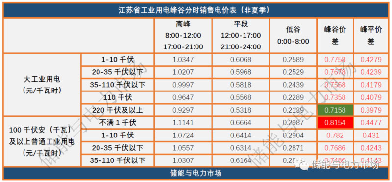 2020年11月3日,江蘇省發(fā)改委發(fā)布了《關(guān)于江蘇電網(wǎng)2020-2022年輸配電價(jià)和銷售電價(jià)有關(guān)事項(xiàng)的通知》。根據(jù)通知的內(nèi)容,江蘇省峰谷價(jià)差最大為0.8154,最低為0.7158(如下表)。