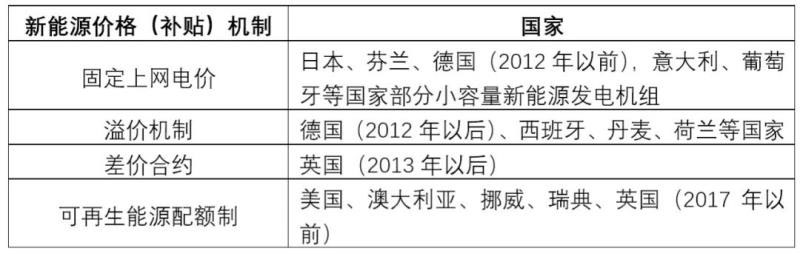 國外新能源價格機制主要包括固定上網(wǎng)電價、溢價機制、差價合約(Contract for difference)、可再生能源配額制等。