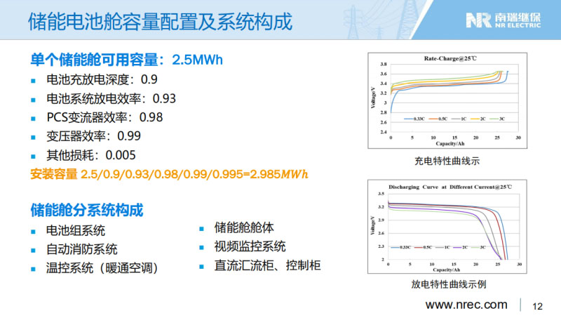許疃也是在預(yù)留場(chǎng)地內(nèi),按照整體方正布置,從電池布置上做了一些考慮。講到容量的問題,剛才湖南綜合能源公司單總強(qiáng)調(diào)了容量的問題,是按照電網(wǎng)側(cè)的容量來考慮,電網(wǎng)側(cè)容量2.5MWh,要達(dá)到80%,直流側(cè)到交流側(cè),通過我們計(jì)算也差不多。包括放電深度、電池系統(tǒng)放電效率,PCS其他損耗整個(gè)算下來直流側(cè)2.985MWh,這是容量問題,基本上80%不到一點(diǎn)。儲(chǔ)能艙分系統(tǒng)構(gòu)成,大家都很清楚了,就不多說了。