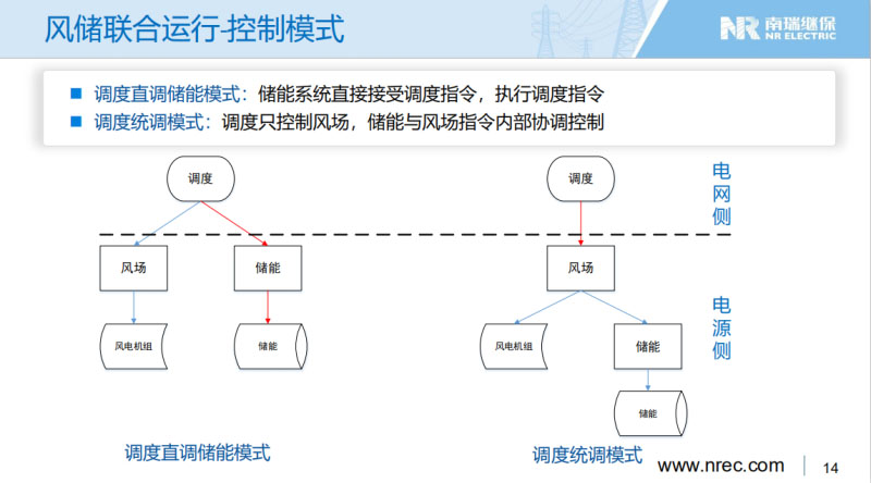 控制模式這是大家關(guān)心的,風(fēng)儲(chǔ)聯(lián)合運(yùn)行怎么控制,總結(jié)來說有兩個(gè)模式,一是調(diào)度直調(diào)儲(chǔ)能模式,相當(dāng)于是大負(fù)荷又是電源;二是調(diào)度統(tǒng)調(diào)模式,對(duì)風(fēng)場(chǎng)來看,儲(chǔ)能和風(fēng)場(chǎng)指令內(nèi)部協(xié)調(diào)控制。