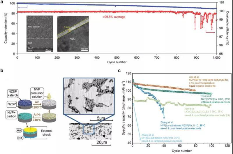 圖7 全固態(tài)電池的電化學性能。a)將Ag–C|Li6PS5Cl|LiNi0.90Co0.05Mn0.05O2(NMC)原型軟包電池(0.6 Ah )的循環(huán)性能和庫侖效率與循環(huán)次數(shù)作圖。施加了0.5 C/0.5 C的充電/放電速率。NMC正極的面積容量負載為6.8 mAh cm-2(1.0 C = 6.8 mA cm-2)。插圖顯示了LZO包覆NMC顆粒的TEM圖像。b)滲透全固態(tài)鈉電池的設計和制造。c)帶有液體電解液的不同全固態(tài)鋰鈉電池的放電容量下降。