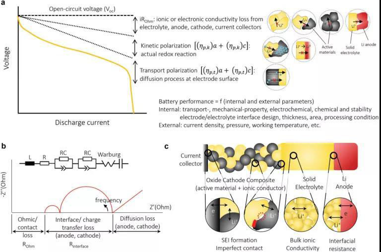 圖2 a)電池的典型放電曲線,顯示了各種極化的影響。電池的總電壓(V)低于施加外加電流后的開路電壓(V oc),這由于多種物理現(xiàn)象而導致電壓下降。b–c)帶有頻率和固態(tài)電池相關(guān)組件的經(jīng)典阻抗譜。(c)受SEI形成,不完善的接觸和界面開裂的影響。