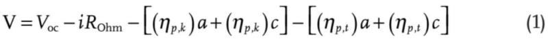 Voc是標準的電池電勢;i是施加的電流; ROhm是電池的歐姆電阻;(ηp,k)a和(ηp,k)c分別是指負極或正極的動力學極化;(ηp,t)a和(ηp,t)c是分別與負極和正極界面處的電荷轉(zhuǎn)移有關(guān)的傳輸極化。這些代表了電壓-放電曲線中的非線性影響。