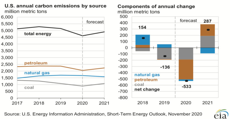 EIA預(yù)測(cè),美國(guó)能源相關(guān)二氧化碳排放量在2019年較上年減少2.6%后,由于所有化石燃料的消耗量減少,到2020年將減少10%。EIA預(yù)計(jì)煤炭排放量將比2019年下降18%,石油排放量將比2019年下降13%。排放量的下降是由于應(yīng)對(duì)新冠疫情而導(dǎo)致的經(jīng)濟(jì)增長(zhǎng)放緩導(dǎo)致的能源消耗減少。EIA預(yù)測(cè)隨著經(jīng)濟(jì)復(fù)蘇和能源使用的增加,2021年美國(guó)與能源相關(guān)的二氧化碳排放量將在2020年的基礎(chǔ)上增加6%。