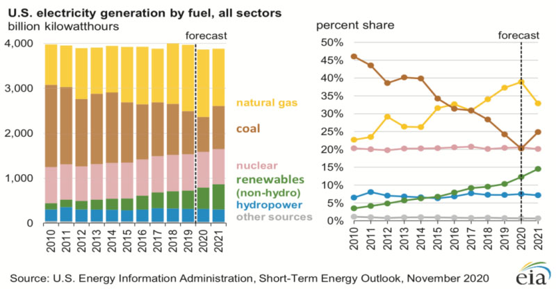 煤炭發(fā)電量的預(yù)測(cè)份額從2019年的24%下降到2020年的20%,然后在2021年增加到25%。