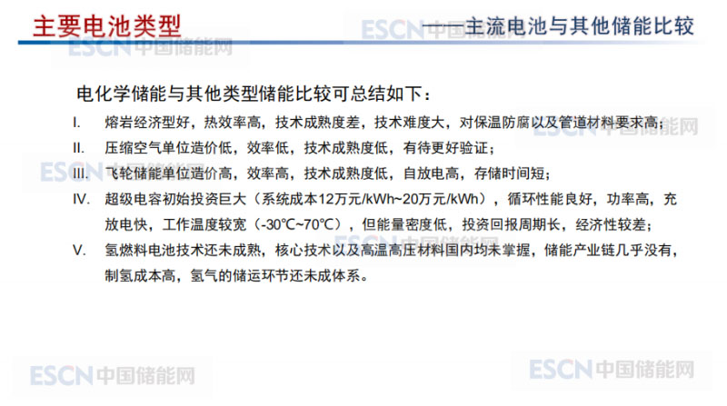 我們主流電池和其他形式儲(chǔ)能相比較,熔巖經(jīng)濟(jì)型比較好,熱效率比較高,技術(shù)成熟度比較差,技術(shù)難度大,對(duì)保溫防腐和管道材料要求高;壓縮空氣單價(jià)造價(jià)低,效率低,技術(shù)成熟度低;飛輪儲(chǔ)能造價(jià)高,效率高,但是存儲(chǔ)時(shí)間很短,有可能作為調(diào)頻應(yīng)用?,F(xiàn)在永德后備電源和動(dòng)能回收。超級(jí)電容投資非常大,但是循環(huán)性能好,功率高,充放電快,工作溫度廣,但是非常貴,不具有經(jīng)濟(jì)型。氫燃料電池是未來的技術(shù),十幾年后發(fā)展應(yīng)用,現(xiàn)在目前的核心技術(shù)還掌握在日本和德國手中,國內(nèi)的生產(chǎn)鏈條,沒有完整的產(chǎn)業(yè)鏈條,所以對(duì)于氫燃料電池還是摸索的階段。