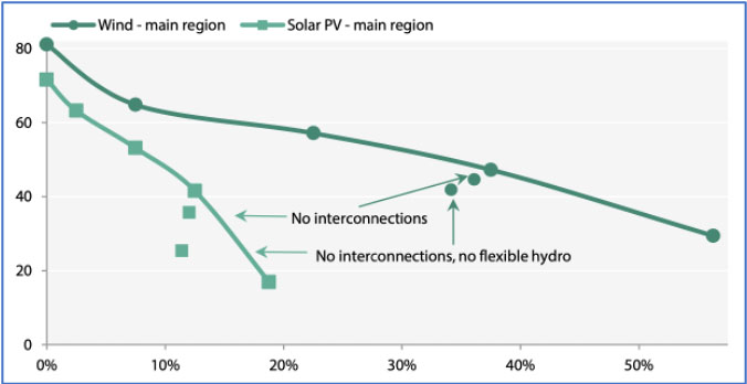 在案例地區(qū),當(dāng)可再生能源滲透率為10%,系統(tǒng)成本約為7美元/MWh(折合人民幣4.76分/kWh)。當(dāng)滲透率提高到30%,系統(tǒng)成本翻倍至17.5美元/MWh,滲透率達(dá)到50%時(shí),系統(tǒng)成本則進(jìn)一步攀升至30美元/MWh。