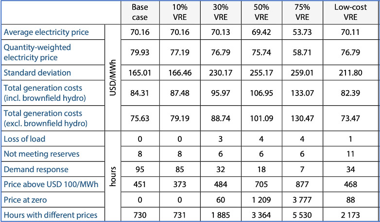 案例地區(qū),可再生能源滲透率上升的初期,市場(chǎng)平均電價(jià)的下降效果相對(duì)有限,但零電價(jià)出現(xiàn)的次數(shù)有顯著上升。滲透率為30%時(shí),每年有60小時(shí)為零電價(jià)。滲透率為50%時(shí),一年中有超過1200小時(shí)的時(shí)間為零電價(jià)。