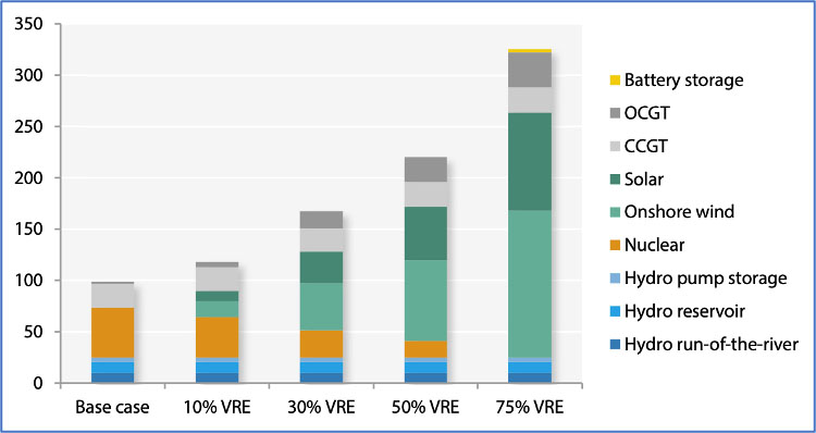但實(shí)際可能產(chǎn)生的變化遠(yuǎn)不止于此。2019年,OECD/NEA曾發(fā)布《The Costs of Decarbonisation》,以一個(gè)年用電量5370億kWh的地區(qū)(如法國(guó))為例,研究在當(dāng)前裝機(jī)格局的基礎(chǔ)上,當(dāng)風(fēng)電、光伏合計(jì)滲透率分別為10%、30%、50%、75%時(shí),區(qū)域在系統(tǒng)成本、可靠性、電價(jià)等方面的顯著變化。