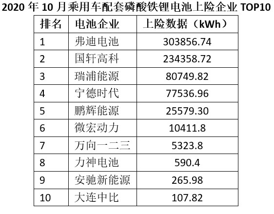 配套電池企業(yè)方面,由于比亞迪·漢的熱銷,10月份弗迪電池也同樣拿下了乘用車磷酸鐵鋰電池配套裝機(jī)量第一的位置。