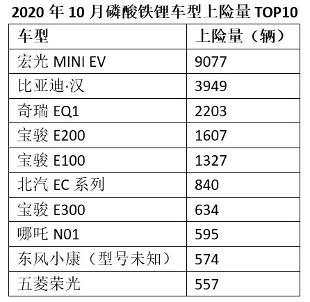 前10款磷酸鐵鋰配套車型分別為比亞迪·漢、宏光MINI EV、奇瑞EQ1、寶駿E200、寶駿E100、北汽EC系列、寶駿E300、哪吒N01、東風(fēng)小康C36和五菱榮光。