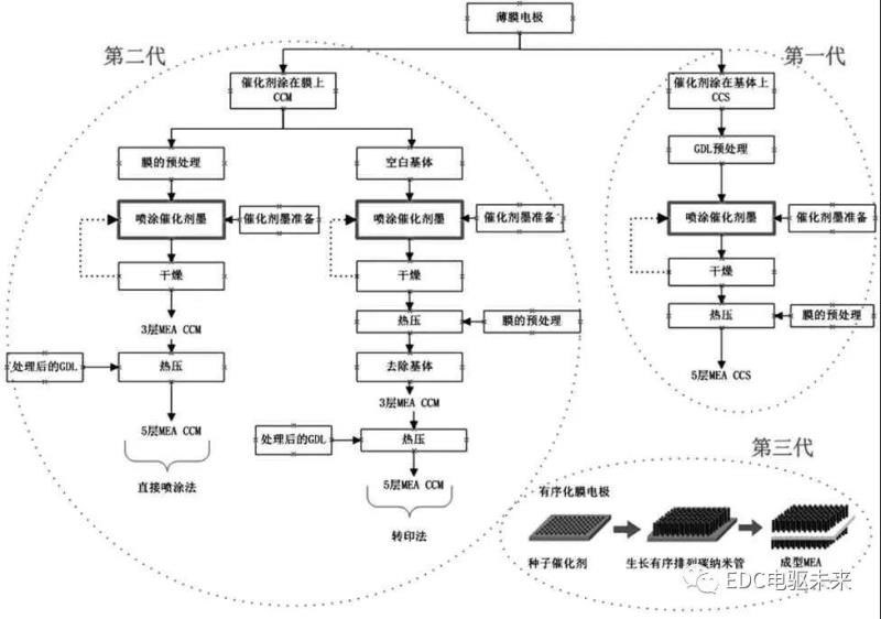 膜電極按催化劑初始噴涂載體可分為GDE 和CCM 2 種模式。GDE 模式是將催化劑噴涂于氣體擴(kuò)散層上,然后熱壓夾住中間的質(zhì)子交換膜。CCM 模式是將催化劑直接噴涂在質(zhì)子交換膜上,然后再覆上氣體擴(kuò)散層。其中因CCM 模式材料利用率高而成為行業(yè)趨勢。CCM 模式又可進(jìn)一步分為轉(zhuǎn)印法、超聲波噴涂法和卷到卷狹縫擠壓法。目前而言,第一代雙面轉(zhuǎn)印CCM 工藝和第二代陰極直涂陽極轉(zhuǎn)印工藝仍繼續(xù)被采用。豐田采用卷到卷狹縫擠壓法進(jìn)行膜電極的生產(chǎn)。雙面噴涂法在解決了質(zhì)子交換膜在膜電極制備中的溶脹、收縮、起皺問題后,其更高的生產(chǎn)效率優(yōu)勢將得以充分顯現(xiàn)。膜電極制備中的催化劑料、溶劑類型和比例、漿料整體粘度、噴涂模具、涂布角度諸多因素影響著膜電極的產(chǎn)品質(zhì)量和性能。