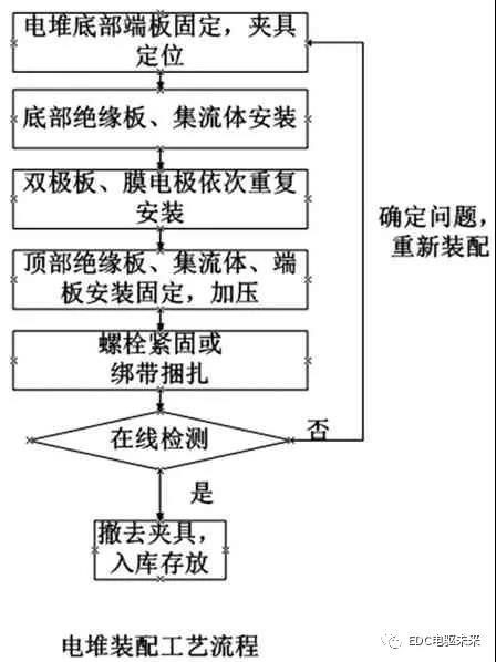 手動裝配在試驗階段和工藝驗證階段,其效率低的劣勢并不明顯。裝配人員借助于定位桿等,將承壓板、絕緣板、集流體、雙極板、膜電極等依次疊羅在一起。在外部加壓裝置的壓縮作用下,壓縮到預(yù)定程度或接觸力后,用螺栓或綁帶緊固在一起。手動裝配由于全過程人為操作,在電堆整體尺寸不大的情況下,可滿足實驗測試要求。但在電堆整體尺寸較大時,累積效應(yīng)產(chǎn)生的裝配誤差以及不一致性,會導(dǎo)致電堆的性能無法達(dá)到設(shè)計要求。電堆的裝配一般工藝流程見圖4。