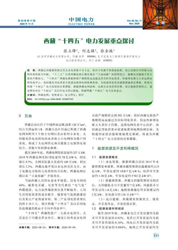 張立鋒, 何志強, 張金枝. 西藏“十四五”電力發(fā)展重點探討[J]. 中國電力, 2020, 53(11): 111-115, 138.