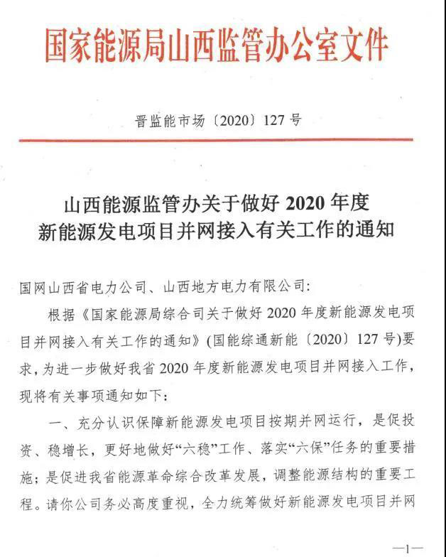 山西能源監(jiān)管辦日前印發(fā)《關(guān)于做好2020年度新能源發(fā)電項(xiàng)目并網(wǎng)接入有關(guān)工作的通知》,要求按照“能并盡并”原則,對于具備全部或部分容量并網(wǎng)條件的新能源發(fā)電項(xiàng)目,采取切實(shí)有效措施,全力統(tǒng)籌做好新能源發(fā)電項(xiàng)目并網(wǎng)接入工作,確保按期并網(wǎng)。