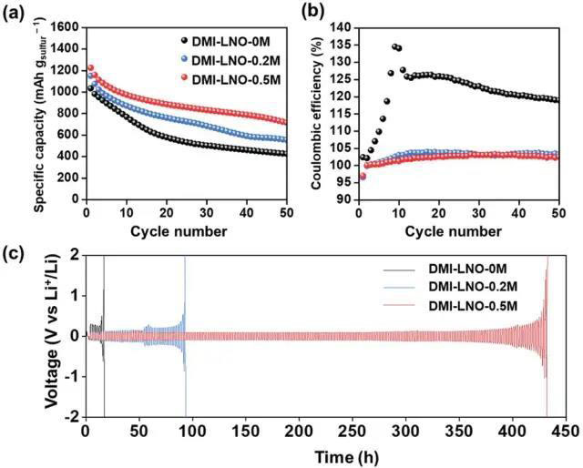 2) 作者使用0.5 M LiNO3作為添加劑來穩(wěn)定鋰負(fù)極,以提升鋰硫電池循環(huán)性能;