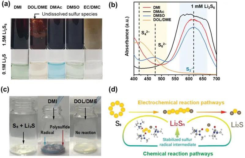1) 首次提出以1,3-二甲基-2-咪唑啉酮(DMI)為鋰硫電池溶劑。DMI對多硫化鋰溶解度高,且二者不發(fā)生反應(yīng);