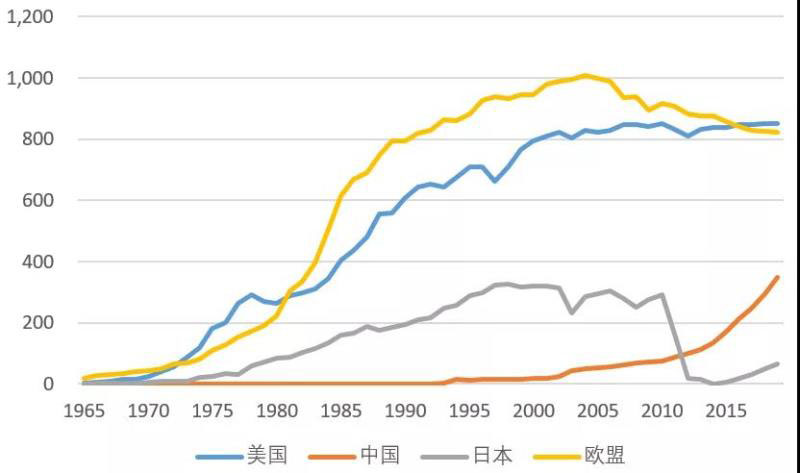 1965-2019年世界部分國(guó)家和地區(qū)核電發(fā)電量(單位:太瓦時(shí))