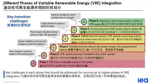 國(guó)際能源署IEA在相關(guān)報(bào)告中詳細(xì)分析了波動(dòng)性可再生能源并網(wǎng)的不同階段劃分,以及給電力系統(tǒng)帶來(lái)的挑戰(zhàn)。IEA報(bào)告指出,隨著可再生能源比例的提高,電力供給的波動(dòng)性增大,那么供需平衡難度會(huì)逐漸增加,需要不斷提高電力系統(tǒng)的靈活性,來(lái)應(yīng)對(duì)挑戰(zhàn),實(shí)現(xiàn)源網(wǎng)荷儲(chǔ)一體化協(xié)調(diào)發(fā)展。