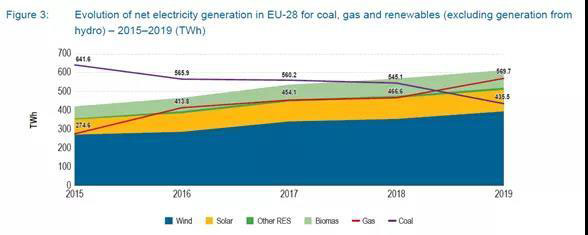 圖8 2015年以來(lái)歐盟28國(guó)煤炭,天然氣和非水可再生能源發(fā)電量(TWh)