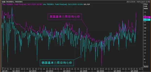 圖7 2018年以來(lái)英國(guó)和德國(guó)基本負(fù)荷日均電價(jià)走勢(shì)(歐元每兆瓦時(shí))