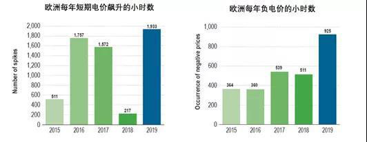 圖6 歐洲每年短期電價(jià)飆升和負(fù)電價(jià)的小時(shí)數(shù)