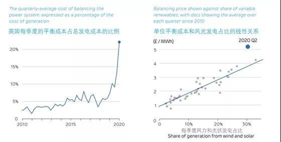 除了對(duì)退煤和綠色轉(zhuǎn)型的潛在影響,可再生能源波動(dòng)性對(duì)電力系統(tǒng)的沖擊尤其是平衡成本的影響也備受關(guān)注。今年5月份,英國(guó)電網(wǎng)為了平衡電力系統(tǒng)供需,要協(xié)商暫時(shí)關(guān)停風(fēng)電場(chǎng)和激勵(lì)需求側(cè)管理,避免風(fēng)光出力高峰階段影響電網(wǎng)穩(wěn)定。英國(guó)發(fā)電商Drax集團(tuán)的最新研究報(bào)告指出,盡管近年來(lái)電力現(xiàn)貨市場(chǎng)平均電價(jià)走低以及負(fù)電價(jià)頻發(fā),但是波動(dòng)性可再生能源給電力系統(tǒng)帶來(lái)的平衡成本不斷增加,平均約為5英鎊每兆瓦時(shí),高于前些年的1英鎊的水平,這有可能增加消費(fèi)者的成本。該分析指出,英國(guó)電力系統(tǒng)的平衡成本隨著波動(dòng)性可再生能源比例的提高已經(jīng)比之前增加了20%。在2010年,每季度平衡成本平均約占總發(fā)電成本的5%, 然而這一比例在近年來(lái)逐漸升高,如圖5左圖所示,在2020年高達(dá)20%以上,每個(gè)月的平衡成本平均一億英鎊。分析還計(jì)算了風(fēng)力和光伏發(fā)電占比和平衡成本的關(guān)系,前者每增加一個(gè)百分點(diǎn),系統(tǒng)平衡成本就增加約0.1英鎊每兆瓦時(shí)。這一平衡成本被電網(wǎng)傳導(dǎo)轉(zhuǎn)移給發(fā)電商和消費(fèi)者,會(huì)造成終端電價(jià)逐漸上升。