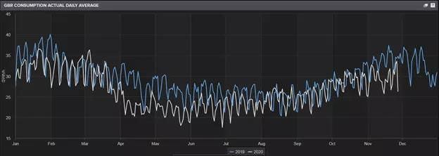 圖3 2019年和2020年英國(guó)日均電力負(fù)荷(GW)