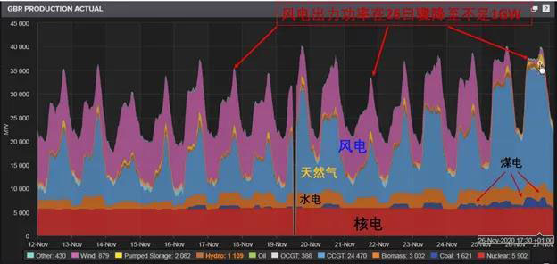 而這次的電力短缺警告,已經(jīng)是英國(guó)國(guó)家電網(wǎng)在兩個(gè)月之內(nèi)第三次發(fā)布類似的通知。10月中旬和11月初,同樣都是因?yàn)轱L(fēng)力發(fā)電極低以及部分電廠維護(hù)而造成電力供需失衡,電網(wǎng)負(fù)荷裕度面臨挑戰(zhàn),電網(wǎng)不得不兩次發(fā)出緊急通告,考慮啟動(dòng)備用電源和需求側(cè)響應(yīng)等靈活性措施,避免出現(xiàn)供需缺口。而英國(guó)電網(wǎng)之前發(fā)布的年度供需預(yù)測(cè),認(rèn)為今年由于疫情壓低電力負(fù)荷,電力供給的可用容量應(yīng)該比往年要略微寬裕,甚至需要補(bǔ)貼核電站在一些時(shí)段削減發(fā)電量來(lái)避免過(guò)高的風(fēng)電沖擊電網(wǎng)系統(tǒng)。總體來(lái)看,由于疫情影響,尤其是10月份以來(lái)歐洲國(guó)家普遍實(shí)施了第二輪封禁措施,電力負(fù)荷一直都低于往年。如圖3所示,2020年的日均負(fù)荷在3月份疫情爆發(fā)之后大幅下降,低于去年水平。最低只17GW,比2019年的最低水平低5 GW。而即便是由于低溫推高了11月26日的電力負(fù)荷,也仍然低于去年同一時(shí)期的水平??梢?jiàn),英國(guó)近期內(nèi)電力短缺警告頻繁的主要原因,還是因?yàn)轱L(fēng)力發(fā)電驟降,反映了可再生能源的波動(dòng)性和間歇性。